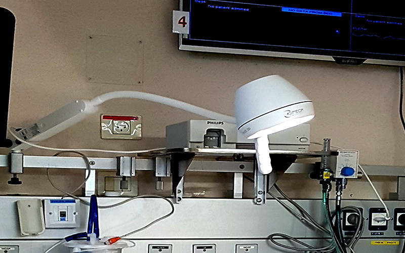מנורת טיפולים כירורגית, דגם: HYDRA, תוצרת צרפת, מנורה דו ראשית רפואית, המאפשרת על ידי מיקום שתי המנורות משני צדי ידיו של המטופל, לבטל הצללות ולעבוד בדיוק רב. אינה מסנוורת את המטופל, ראשי מנורה מותקנים על שתי זרועות גמישות הניתנות למיקום בנפרד. הזרוע הגמישה מספקת את יכולת התמרון הדרושה לשימוש נוח.